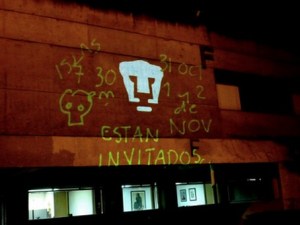 Hoy a Enrique Heredia, Eduardo Ramírez y un servidor se nos ocurrió improvisar una mini sesión de graffiti láser en el edificio de posgrado de la FCPYS de la UNAM.
