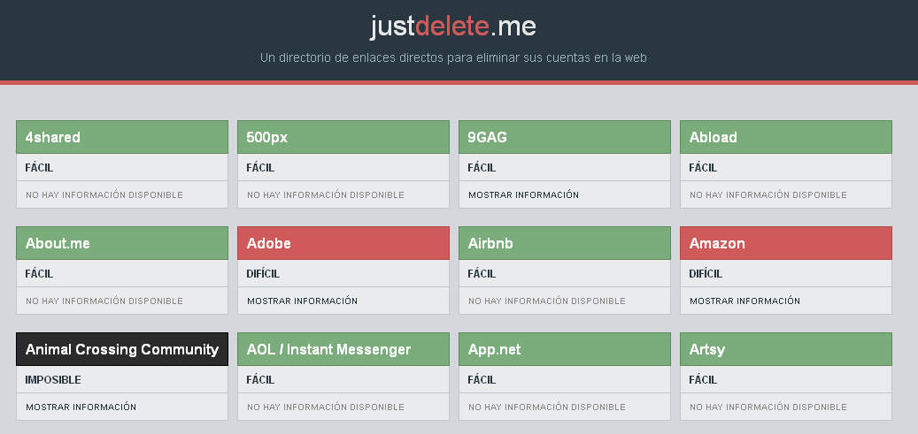 b) En un segundo momento, justDELETE.me ofrece a los usuarios la opción de recuperar la privacidad digital dándose de baja de todos estos caballos de troya 2.0. Por supuesto, con excepciones, ya que habrá sitios que conservarán de por vida los datos de sus usuarios y sitios en los cuales los requisitos son tan laberínticos que anularán cualquier intento por recuperar la libertad personal.