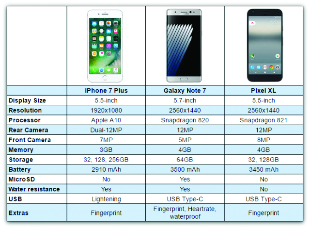 Comparativa entre los tres smartphones rivales de Apple, Samsung y Google. Fuente: http://phandroid.com/2016/10/04/pixel-xl-vs-galaxy-note-7-vs-iphone-7-plus-chart/