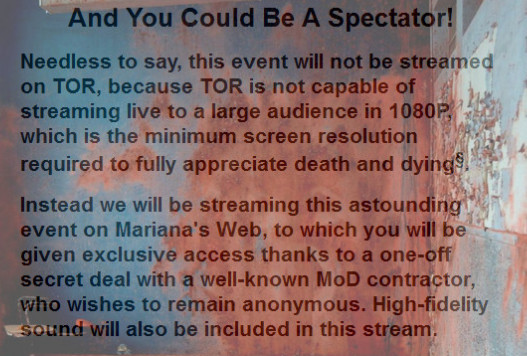 «Tú puedes ser un espectador. El evento no será trasmitido por TOR pues dicha red no es capaz de transmitir en vivo a grandes audiencias, tampoco de ofrecer resoluciones de video de alta resolución 1080P.
