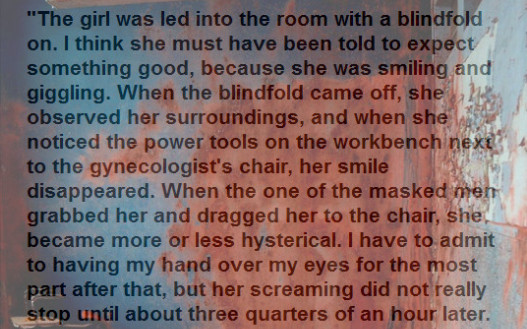 La chica será guiada con los ojos tapados a un cuarto, ella esperará encontrar algo bueno adentro, pero cuando se quite la venda y vea a su alrededor, su sonrisa desaparecerá. Cuando uno de los hombres enmascarados la amarre en la silla… Sus gritos no cesarán hasta pasados cerca de 45 minutos de tiempo.