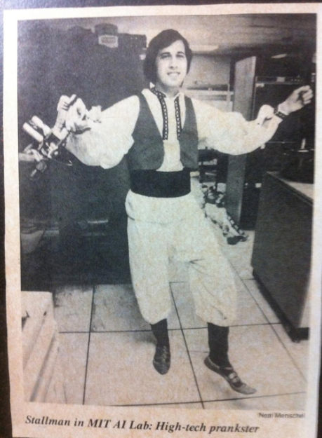 (NOTA: Está imagen de Richard Stallman, el hacker más grande de todos los tiempos, pocos la han visto. Y justo por eso la comparto. Aquí ya dejaba ver su personalidad de «Computer Bum» que tanto molestó a las autoridades del MIT)