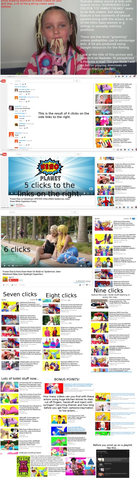 NOTA MIA: Un tema sensible, no apto para todo público, pero es importante denunciarlo pues desde que la ultra sionista-progresista, Susan Wojcicki, se ha hecho cargo de la dirección general de Youtube, no sólo ha introducido el cuestionado YOUTUBE RED; sino que también ha censurado los contenidos críticos e impulsado los que promueven la mitómanía, los extraterrestres, las fake-news y/o la agenda de género más emparentada con la sexualización temprana de los niños.