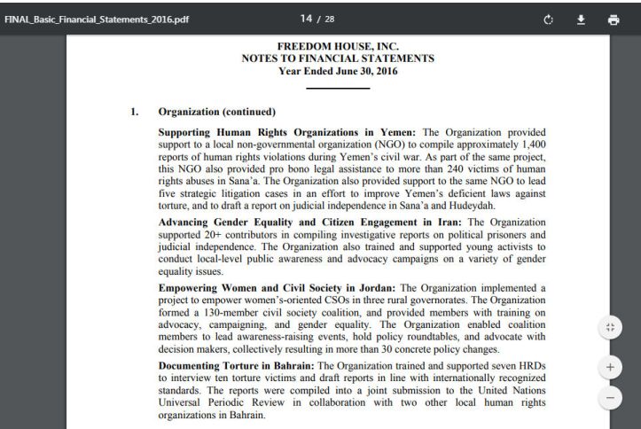 En este punto es importante hacer notar que la Freedom House es la «cara limpia», la cara progresista para la opinión pública de la Fundación Nacional para La Democracia (NED) de los EU, la cual es financiada por organizaciones como:
