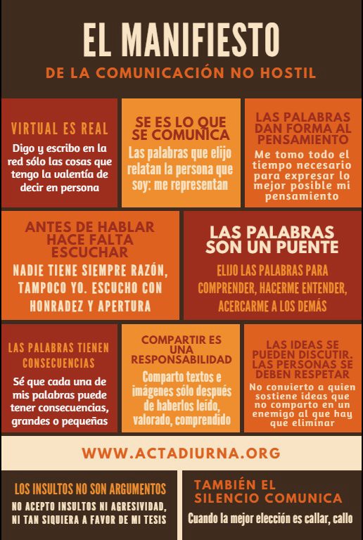 Desde Parole Ostili han elaborado “El Manifiesto de la comunicación no hostil”. Un genial documento a imprimir y colgar en la pared de cada casa. Recoge en diez puntos una serie de pautas de comportamiento a la hora de comunicarnos, tanto en redes sociales como fuera de ellas. Y es que antes de publicar, hablar o compartir deberíamos dedicarle a ese mensaje unos pocos segundos para pensar en el tipo de repercusiones que podría tener tanto en nosotros mismos como en las personas que nos rodean o que están afectadas por determinada temática. Y es que, lo que pasa en las redes sociales no se queda solamente en las redes sociales.
