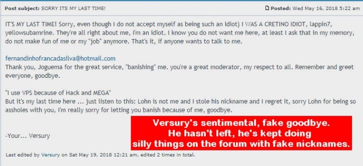 Finalmente Versury fue baneado de la comunidad y su odio se incrementó: nunca fue grosero, pero fue molesto y saturó el foro de tonterías sin sentido a través de sus nuevas personalidades: VersuryPLUS, Lohn Jennon y RockPaul