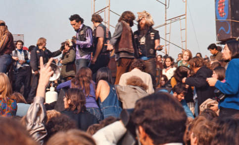 (INICIO) Al darse cuenta de que las circunstancias estaban fuera de su control, los Rolling Stones se replegaron. Frente a la audiencia más numerosa del grupo, los Hells Angels se sentían libres de cruzar el escenario, tomar el micrófono y hablar con la multitud, algo que ni siquiera el más arrogante soldado de la Europa del Este se hubiera atrevido ante los Stones. Hells Angels, de gran tamaño e intimidantes rodeaban a las Rolling Stones, mirándoles como animales enjaulados al momento de comer, y la amenaza era real. Los Ángeles no paraban de golpear a la gente a plena vista de la banda. No prestaban atención a las súplicas de Jagger ni a la amenaza vacía de Richards de dejar de tocar.