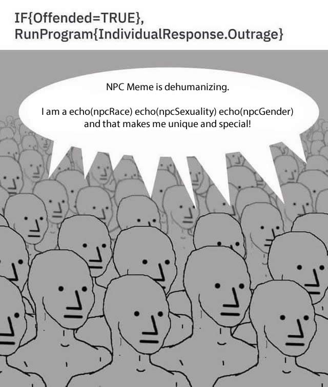 Es por esta razón que el meme del PNJ se usó para referirse al aparente pensamiento grupal de gente como los Guerreros de la Justicia Social y los miembros de Antifa, que actúan como un colectivo, sacrificando la individualidad por un conjunto de respuestas progresistas o políticamente correctas preprogramadas.El colectivo «mob rule» (gobierno de la muchedumbre) parece encajar con la metáfora del PNJ hasta en los detalles, incluida la repetición de las cadencias en sus mítines. Oh, pero va más allá de eso. Hablando del «mob rule», si cambiamos las letras de la palabra MOB por las que le siguen en el alfabeto, ¿qué obtenemos? Esperaré. ¿Entendido? Bastante elegante, ¿eh? [PNJ es NPC en inglés.- NdT.]
