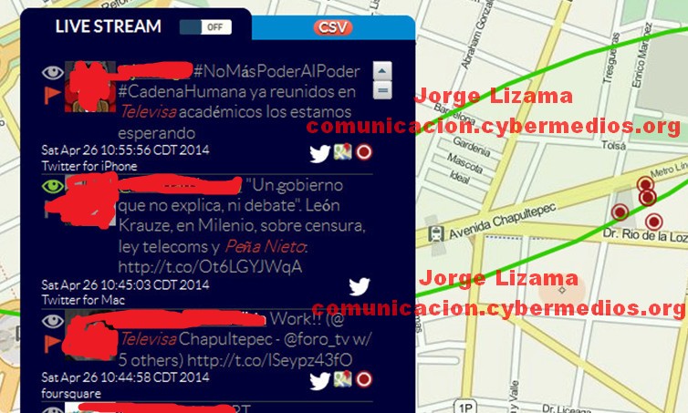 Los puntos en rojo en el mapa representan el lugar geográfico donde se encuentra el responsable del “tuit”. Por supuesto, esto último sólo aplica para usuarios con dispositivos móviles. En la columna azul van pasando todos los tuit que el programa captura, más o menos 10 por minuto de todo tipo de usuarios de twitter que toquen palabras claves sobre el tema o que sigan hashtags como #CadenaHumana, #LeyTelecom, #NoMasPoderAlPoder, etc.