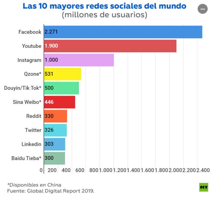 El documento sostiene que Facebook sigue siendo la red sociodigital más grande del planeta, con 2.271 millones de usuarios en 2019. Esto significa que la red social de Zuckerberg tiene influencia en un tercio de la población mundial.