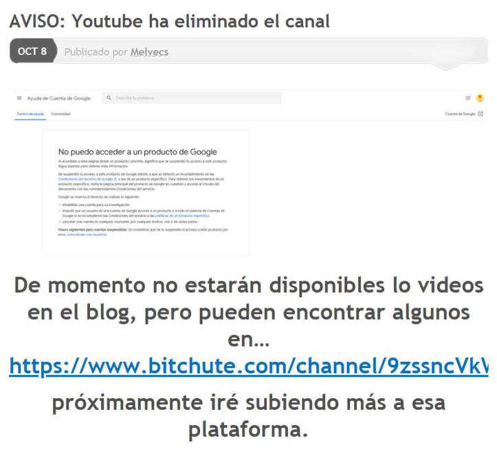 Se que Melvecs va a ir subiendo poco a poco sus videos a la plataforma alternativa de BItchute, que tiene esta dirección.