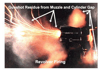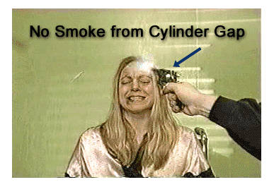 Cuando un revólver se dispara, hay un pequeño espacio abierto entre el cilindro que sostiene los cartuchos y el barril. Aunque la munición moderna no produce mucho humo visible, los gases calientes son expulsados tanto por el cañón como por la abertura del cilindro.