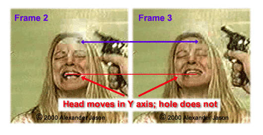 Después del disparo en el cuadro 1, la cabeza parece girar hacia atrás y hacia abajo. El «agujero de bala» en la frente de la mujer no sigue el movimiento de la cabeza, sino que parece estar inmóvil en el marco, lo cual es consistente con un «agujero» creado digitalmente y aplicado sin cuidado.