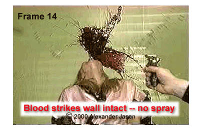La «sangre» que se proyecta contra la pared parece haber entrado en contacto con la pared intacta como si fuera un globo estrellado. La sangre que se muestra se esparce después de golpear la pared, no en el aire. El volumen de sangre es mucho mayor de lo que sería consistente con la herida de cabeza de una herida de arma de fuego de pequeño calibre.
