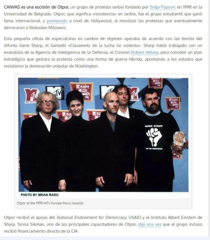 A este origen meramente histórico, le sigue la caída del Muro de Berlín y la formal puesta en práctica de un think tank financiado por la CIA en Serbia para luchar en contra de la hegemonía de los rusos en la región. Así, nacieron las asociaciones Otpor y su hijo más radical: Canvas, para crear revolucionarios mk-ultra que ayudaran a cambiar regímenes no sólo en lo político, sino también en lo institucional.