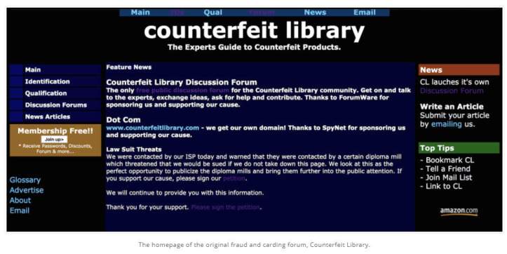 CAPTURA: Página principal del foro original sobre fraude con tarjetas de crédito. La llamada, la Biblioteca de Falsificaciones.