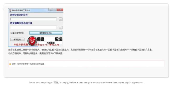 CAPTURA: Los mensajes requiere un «回复»,, o una respuesta, antes de que un usuario pueda acceder al software que copia firma digitales.