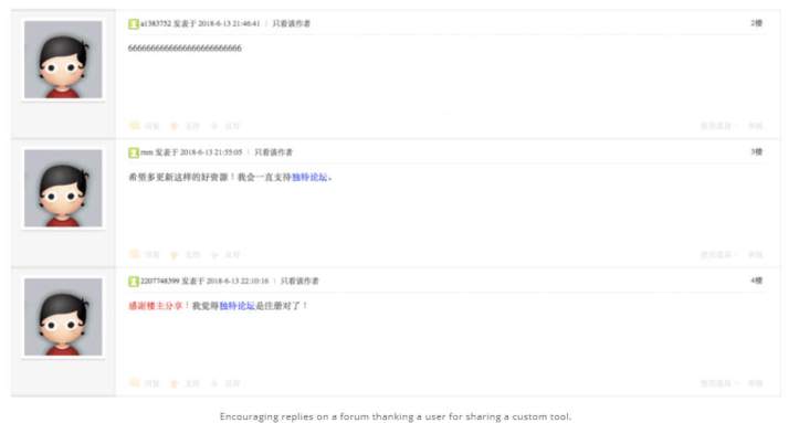 Esto requería la interacción social con otros miembros del foro para construir una comunidad; los comentarios en los foros van desde la jerga que elogia las herramientas escritas por los anunciantes, hasta los mensajes que agradecen al vendedor directamente. Además, los hackers chinos anuncian aplicaciones para programas de aprendizaje en foros similares, donde un hacker más experimentado enseñará a un aprendiz por una cuota, dividiendo el trabajo entre los miembros según su nivel de habilidad. Los hackers potenciales también pedirán tutela para involucrarse más en la comunidad. Esta voluntad de enseñar y el compromiso social está en claro contraste con las normas de los foros de lengua rusa que hemos detallado anteriormente.