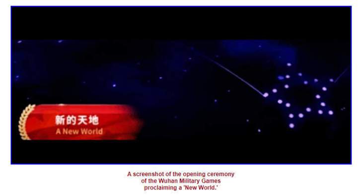 Una captura de pantalla de la ceremonia de apertura de los Juegos Militares de Wuhan proclamando un «Nuevo Mundo».