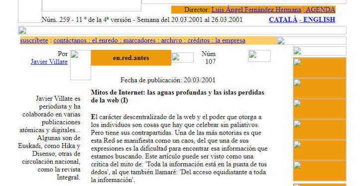 Así, pues, no es exacto decir que mi página personal está a la misma distancia ciberespacial que la página de Microsoft. Eso solo es cierto en términos teóricos abstractos que ignoran que en la web existe un centro y una periferia, y que para llegar al primero hay millones de guías e indicaciones, mientras que para viajar a la periferia de la web hay, muchas veces, que ‘buscarse la vida’ o, sencillamente, hacer un fortuito descubrimiento.