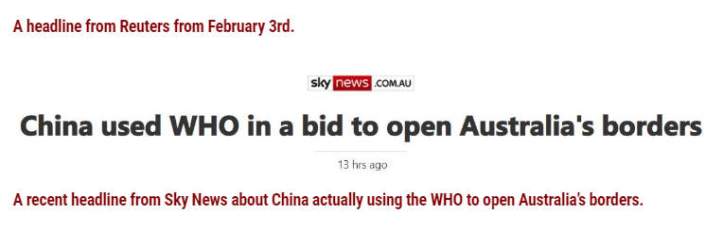 Un reciente titular de Sky News acerca de China usando la OMS para abrir las fronteras de Australia.