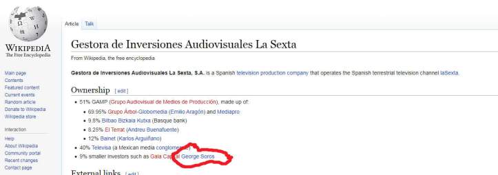 Hasta La tendenciosa wikipedia no puede dejar de aceptar que la SEXTA está relacionada con Soros.