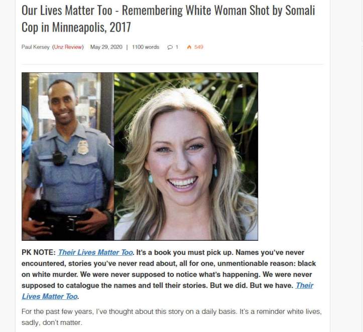 Aquí arriba, justo el caso contrario a lo de Floyd, policía negro asesinando a mujer blanca. A los sjw de S0r0s no les importó. Nadie salió a quemar autos.