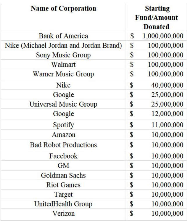 Lo que sorprende es la escasez de corporaciones y la mezquindad de las donaciones. En cierto sentido, esto muestra la verdadera consideración que las corporaciones de América tienen por la gente negra y es, en realidad, el motivo por el que las marchas y demostraciones fueron necesarias en primer lugar. Las corporaciones en nuestra lista de la base de datos de respuesta BLM ganaron más de 400 mil millones de dólares en 2019. Aunque entendemos que el nivel de incertidumbre en la economía justifica la conservación de los recursos monetarios, estas instituciones son los principales beneficiarios de la facilidad de crédito corporativo de la Reserva Federal, una expansión de 6,7 billones de dólares en el balance de la Reserva Federal específicamente diseñada para ayudar a estas corporaciones.