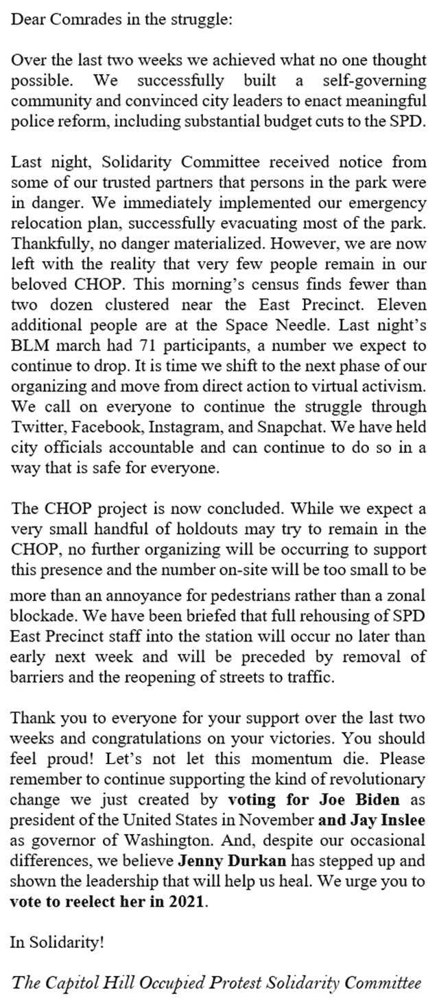 RESPUESTA: por que se le estaba saliendo de las manos a la administración demócrata de Seattle, aliada al pantano y a los Clinton. En lugar de restar votos a Trump, iban a empezar a perderlos para Biden, por eso ordenó que todo terminara de forma pacífica.