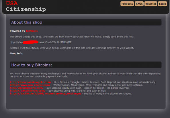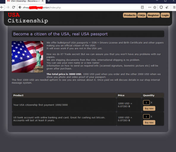 El sitio de la darknet ofrece en TOR ciudadanía de los EE.UU. mediante pasaportes, los cuales se venden por 3000 USD cada uno, y la transacción se realiza en dos momentos: