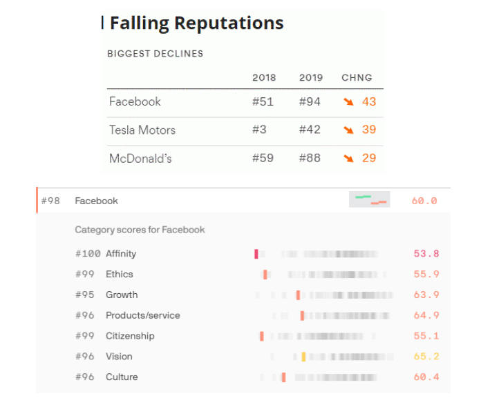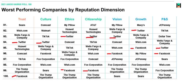 Fakebook fue el número 1 en caer durante ese periodo, pasando del número 51 al 94. Fakebook ocupó el puesto nº 95 en cultura y ciudadanía, y el nº 96 en confianza y ética. Twitter ocupó el puesto nº 93 en ética y el nº 89 en general. Se encuentra cerca del final de la lista, en el territorio de la ignominia, con Wells Fargo y Goldman Sachs, ambos envueltos en escándalos enconados y costosos; y Sears, que está en quiebra.