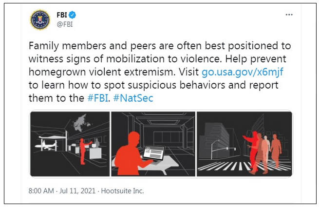 «Los miembros de la familia y los compañeros son a menudo los mejor posicionados para presenciar los signos de movilización hacia la violencia», dijo el FBI. «Ayude a prevenir el extremismo violento para aprender a detectar comportamientos sospechosos y denunciarlos al #FBI.»