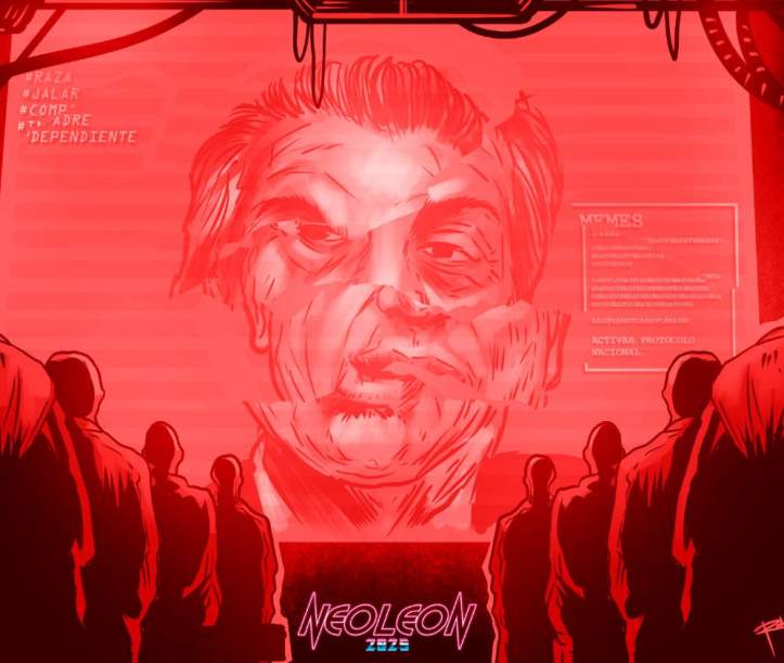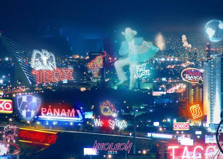 Tanto en su instagram como en facebook y bajo el nombre de NEOLEON 2025, uno puede encontrar ejemplos y postales de un hi-tech mexicano que suma elementos tan apocalipticamente propios como la narcocultura, la música de banda, la enajenación por los deportes y las marcas, la contaminación, etc.