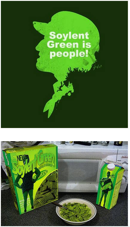 La pelicula es de 1972, en España titulada «Cuando el Destino nos alcance». El argumento es «inverosímil» -convertir seres humanos en alimento en forma de galletas verdes, ecológicas, basadas oficialmente en la lenteja verde (Soylent Green)-. Es curioso que el año elegido para la distopía sea 2022.