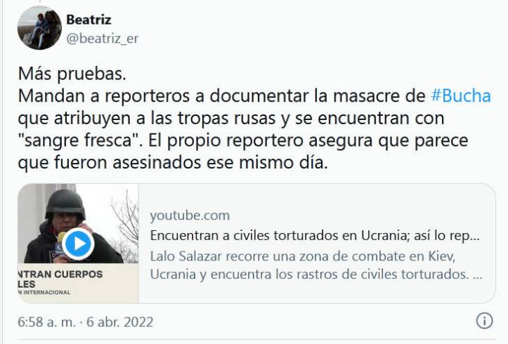 Si los Ucranianos tenían el control de Irpin el 29 de Marzo, y Lalo vio sangre fresca el día 1-Abril, (3 días después), y dice que habían sido asesinados «hoy», entonces claramente la matanza la han hecho los Ucranianos.