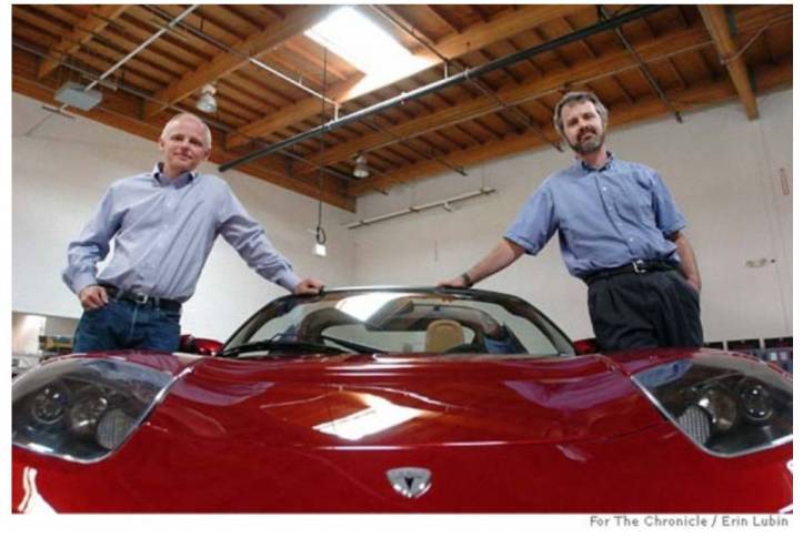 Fíjate en dos cosas de esa foto de 2003. Una, Musk no está en la foto. Son Eberhard y Tarpenning. Dos, el Tesla Roadster está completo. No están posando con dibujos o esquemas, ¿verdad? Están posando con un coche. Si usted no me cree, pregunte a Martin Eberhard, que demandó a Musk en