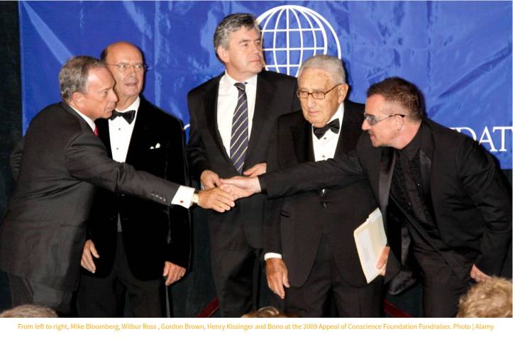 Desde su primera gran incursión en el activismo en el concierto Live Aid de 1984 (en el que gran parte del dinero recaudado se destinó supuestamente a la compra de armas para el ejército etíope), Bono se ha convertido en un rostro casi omnipresente en los salones del poder, siendo invitado a hablar en multitud de eventos de élite sobre la pobreza, como la Conferencia de Seguridad de Múnich, la cumbre del G8, el Banco Mundial y en el Foro Económico Mundial. Allí se le suele tratar como la voz de África y una potencia intelectual y moral que ayuda a resolver los problemas humanitarios más acuciantes del mundo.