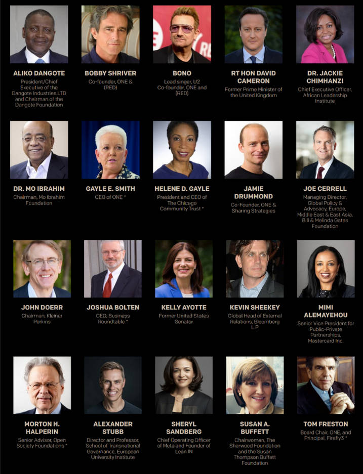Con sede en la Avenida Pennsylvania, a dos manzanas de la Casa Blanca, la Campaña ONE es un gigante de las ONG, que recibe financiación de muchas de las mayores empresas del mundo, como Bank of America, Coca-Cola, Johnson & Johnson y Google. También colabora estrechamente con otras organizaciones de élite como la Fundación Bill y Melinda Gates y la Open Society Foundations. Aunque sus objetivos declarados de reducir la pobreza y la enfermedad son loables, no está claro en qué medida ha contribuido a ello. Al fin y al cabo, si quitamos a China de las estadísticas, la reducción de la pobreza mundial va en dirección contraria. Y aunque afirma ser una «organización de defensa y campaña de base», un vistazo a la junta directiva de la empresa sugiere una historia diferente.