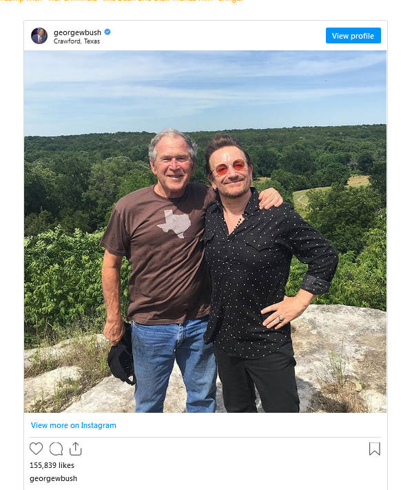 Mucho después de la retirada de Bush, Bono sigue reuniéndose con el ex presidente, visitando su rancho de Texas en 2017. Un año después, Bono fue el receptor inaugural de la Medalla George W. Bush al Liderazgo Distinguido, que el irlandés describió como un «enorme honor.» Al hablar de su trabajo conjunto sobre el sida en África, Bono dijo que deseaba «honrar su liderazgo en la mayor intervención sanitaria de la historia de la medicina.» Bush respondió que estaba impresionado por los conocimientos de Bono.