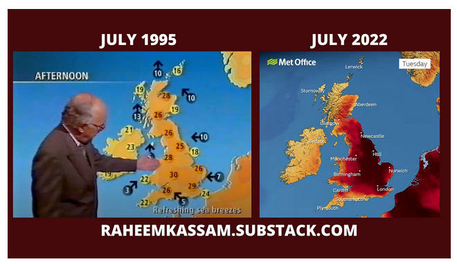 Observe, en 1995, cuando «John Kettley era el meteorólogo (y también lo era Michael Fish, en la foto de abajo) , una temperatura de 30 grados centígrados se reflejaba con un color naranja suave. Eso es 86 grados para ustedes los americanos. O «clima de suéter» si estás en Arizona.