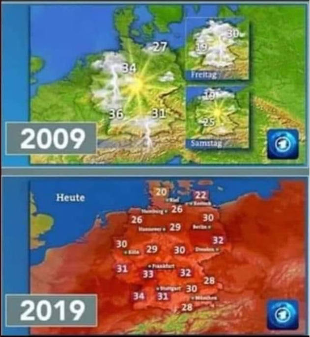 Lo que alguna vez fue la cara sonriente y feliz del sol que nos hacía saber que podíamos desnudarnos y correr por los aspersores del vecindario (cuando éramos niños, por favor, no hagamos esto como adultos) ha sido reemplazado por el rojo más profundo y oscuro que las empresas los departamentos de gráficos de medios pueden crear, diseñados para invocar nociones del infierno en la Tierra.