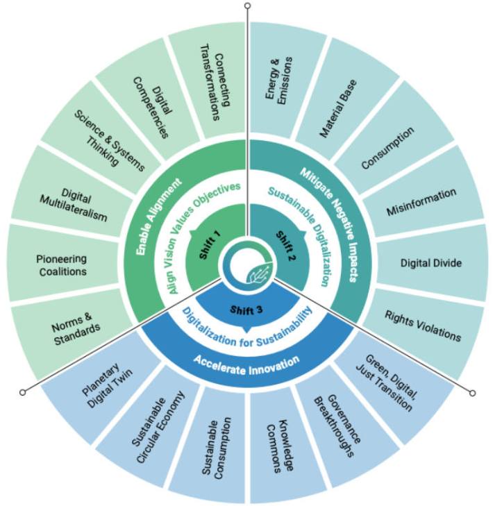 Para alcanzar los objetivos, se propone la creación de una «Comisión Mundial sobre la Sostenibilidad en la Era Digital» con el fin de investigar y ofrecer información con orientación científica sobre cómo debe lograrse la sostenibilidad en la era digital. Sus conclusiones, a su vez, constituirán la base de una plataforma mundial (Clearing House for Digital Sustainability Standards) que desarrolle normas de sostenibilidad digital y financiera. Estos conocimientos se difundirán después a través de programas educativos descentralizados.