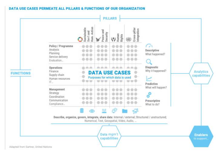 La base de todo son los datos. De acuerdo con la estrategia de datos del Secretario General, la Estrategia de Datos del Secretario General de las Naciones Unidas 2020-22 , esto debería impregnarlo todo y guiarnos a través de la Gran Transformación. Esta estrategia de datos significa la actualización y digitalización de las Naciones Unidas. Describe cómo utilizar todos los datos que se recopilan (Big Data, sensores/IoT, sonido, imagen, texto, etc.). [1] Los objetivos globales de desarrollo sostenible (ODS) de la Agenda 2030 deben alcanzarse con la ayuda de la tecnología digital. Esto incluye áreas como el cambio climático, la igualdad de género, los derechos humanos, la paz y la seguridad, la gobernanza y la ética futura, la protección de datos y la privacidad.