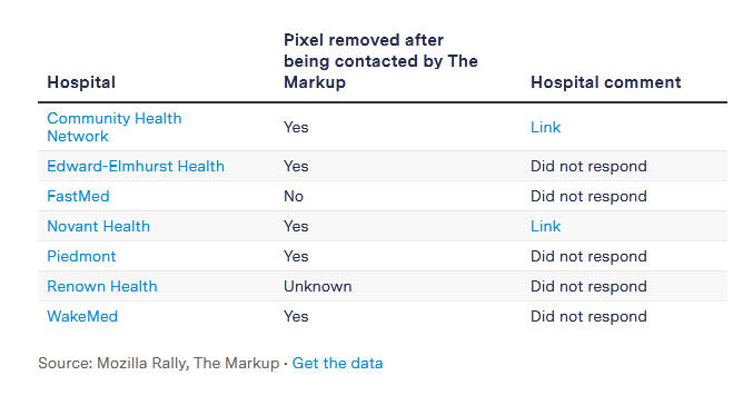 Después de revisar los hallazgos de The Markup, el Hospital Froedtert retiró el Meta Pixel de su sitio web «por exceso de precaución», escribió Steve Schooff, un portavoz del hospital, en un comunicado.