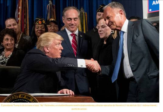 El presidente Trump le da la mano a Isaac «Ike» Perlmutter, un multimillonario israelí-estadounidense y director ejecutivo de Marvel el 27 de abril de 2017. Andrew Harnik | punto de acceso