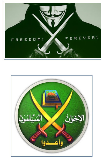 Otro ejemplo evidente es el escudo de Anonymous, el cual maneja una especie de dagas o espadas como marca representativa. Armas que son una copia identica del escudo de los hermanos Musulmanes: el grupo de choque y terrorista de los EU para imponer los intereses del neoliberalismo en Asia y Africa.