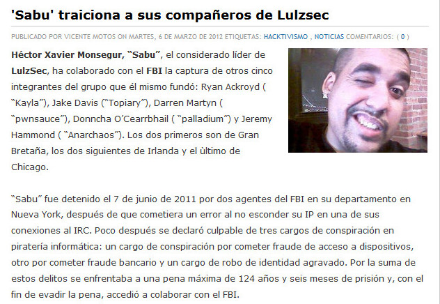 e) CONTRADICCIONES INTERNAS: existen también las contradicciones internas que más parecen un juego entre mafías, como Anonymous y LulzSec; o la moral del líder, Sabú, que ahora trabaja para el FBI; o el caso de Dennis Collins, etc. pero no tendré tiempo de tocarlas en este momento, sólo expongo los elementos esenciales que cualquiera puede buscar en internet para darse cuenta de cómo operan estos mercenarios digitales y cómo se venden al mejor postor.