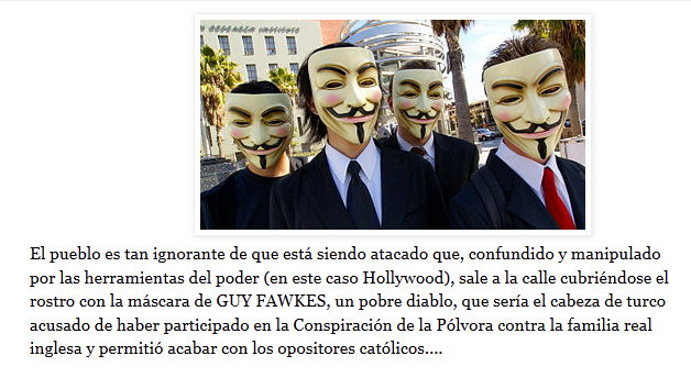 Lo cuestionable de ANONYMOUS es que decida retomar a un terrorista blanco, inglés y del primer mundo (no asiático, latino, africano, que verdaderamente se la juegan y son crucificados por el sistema); para paradojicamente a nivel de símbolos defender al mundo de la opresión de la élite blanca que controla el 90% de la economía mundial.