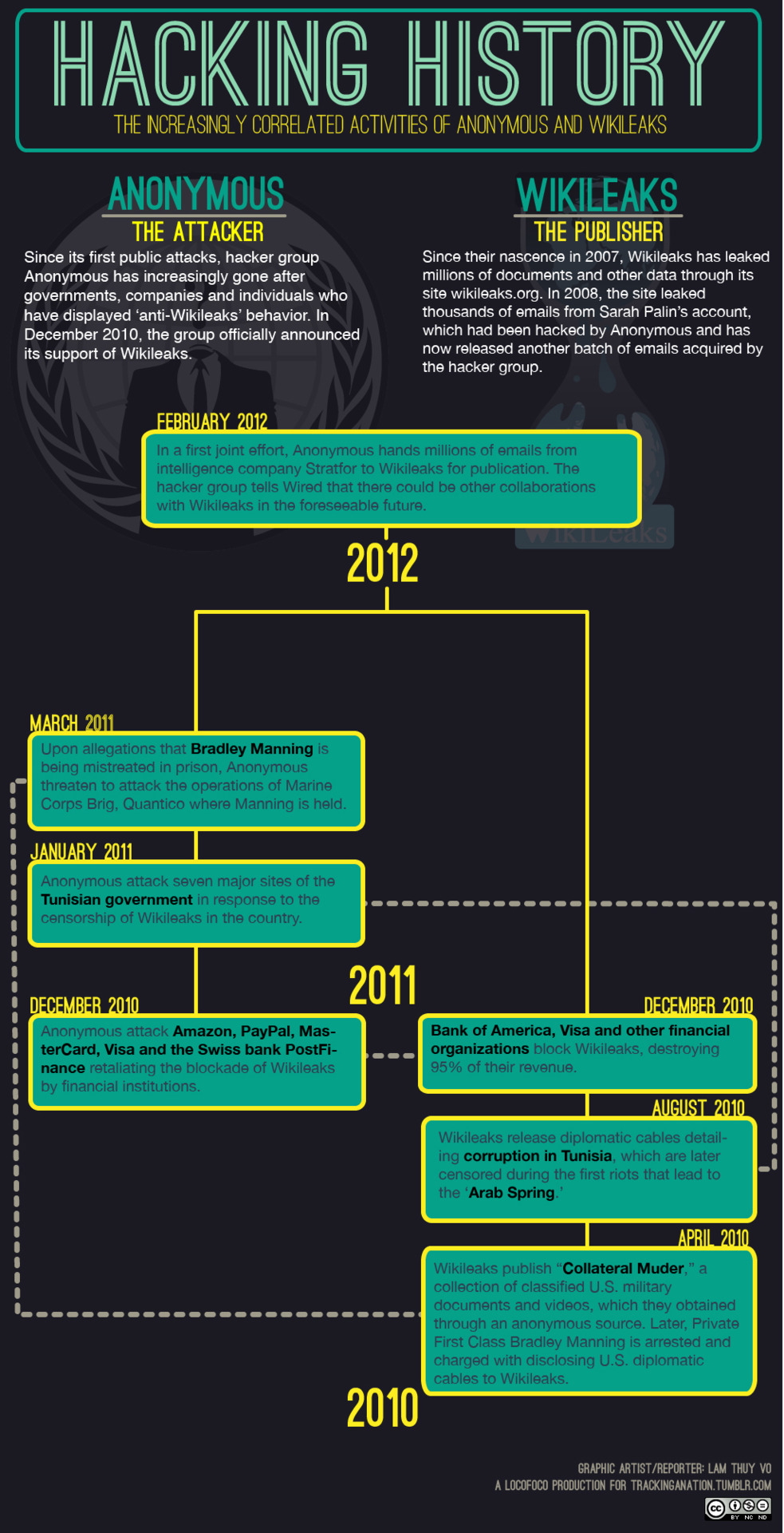 Pero en el 2008 Anonymous era aún muy poco conocido, su verdadero bautizo mediático ocurrió hasta el 2012, cuando empieza a tener una relación muy estrecha con Wikileaks y Julian Assange (otra falsa bandera, en aquel entonces, comandada por la Open Society de George Soros y ahora, en el 2017, respondiendo también a los intereses de la banca depredadora de Goldman Sachs y Donald Trump).